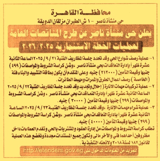 HOT Information مناقصة عامة لعملية رصف شوارع الحي (فئة التصنيف الخامسة شعبة أعمال رصف الطرق والممرات ومهابط الطائرات) عن جريدة الجمهورية Post navigation الغرفة التجارية المصرية بالإسكندرية رئاسة حي المعادي