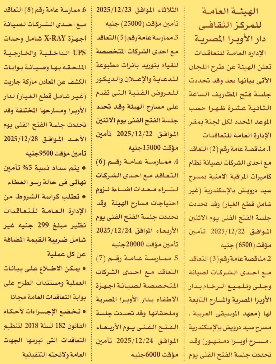 HOT Information مناقصة عامة رقم 2 لعملية التعاقد على صيانة نظام كاميرات المراقبة الأمنية بمسرح سيد درويش بالإسكندرية غير شامل قطع الغيار عن جريدة الأهرام Post navigation الهيئة العامة للسد العالي وخزان أسوان محافظة الشرقية