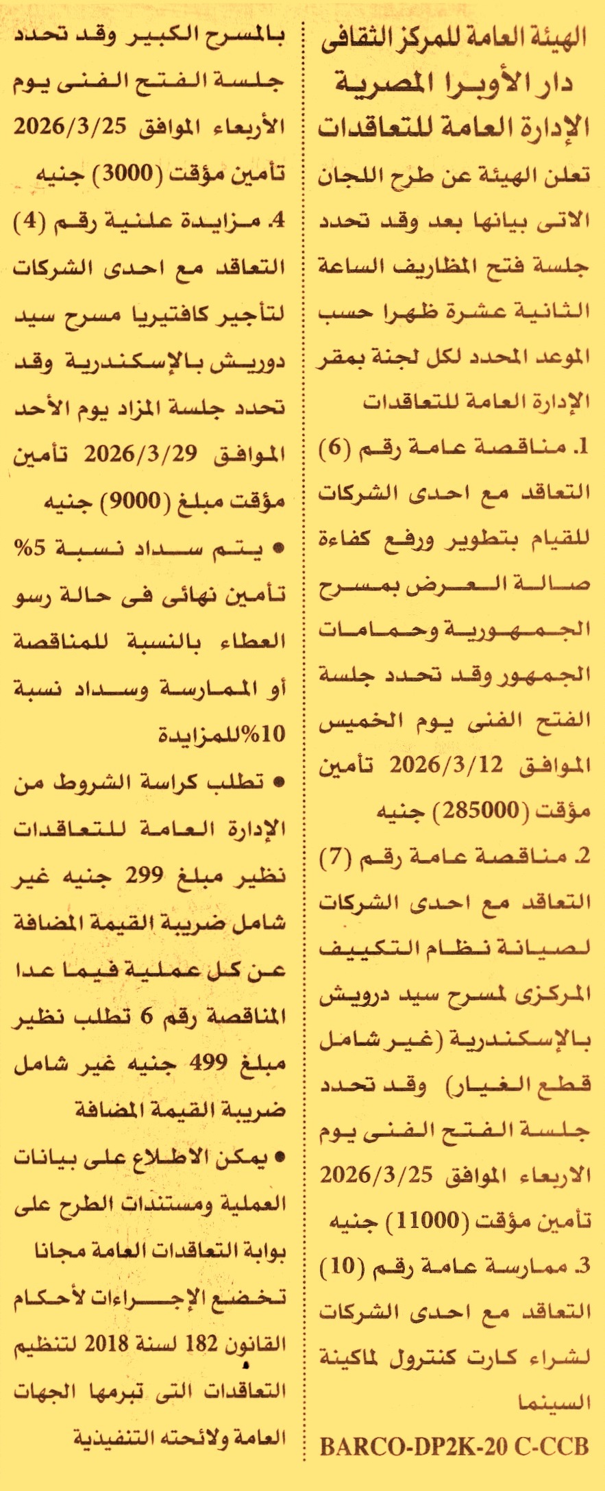 HOT Information مناقصة عامة رقم 6 لعملية تطوير ورفع كفاءة صالة العرض بمسرح الجمهورية وحمامات الجمهور عن جريدة الأهرام Post navigation جمعية عطاء بلا حدود لتنمية المجتمع بمحافظة أسيوط وزارة التربية والتعليم والتعليم الفني
