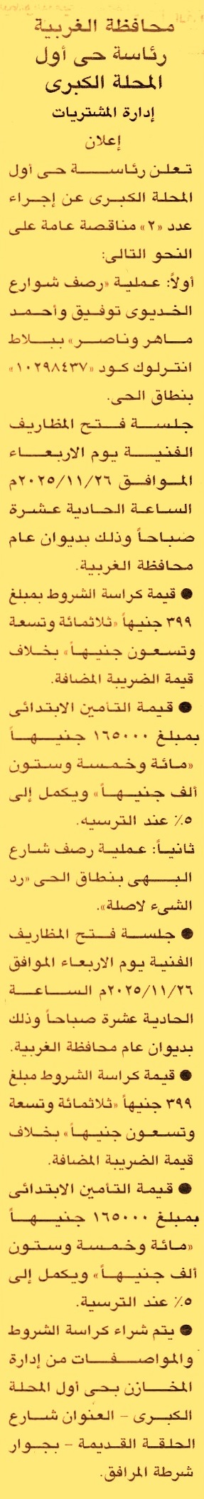 HOT Information مناقصة عامة لعملية رصف شوارع الخديوي توفيق وأحمد ماهر وناصر ببلاط انترلوك كود 10298437 بنطاق الحي عن جريدة الجمهورية Post navigation محافظة سوهاج الشركة البورسعيدية للأعمال الهندسية والإنشاءات البحرية