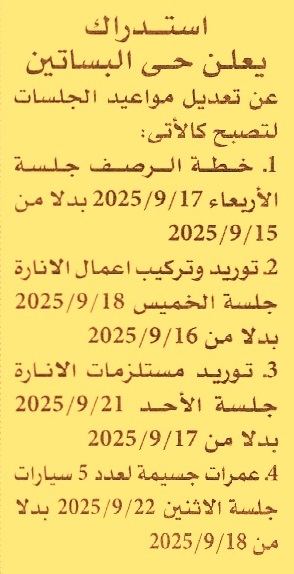 يعلن الحي عن تعديل مواعيد الجلسات لتصبح كالأتي