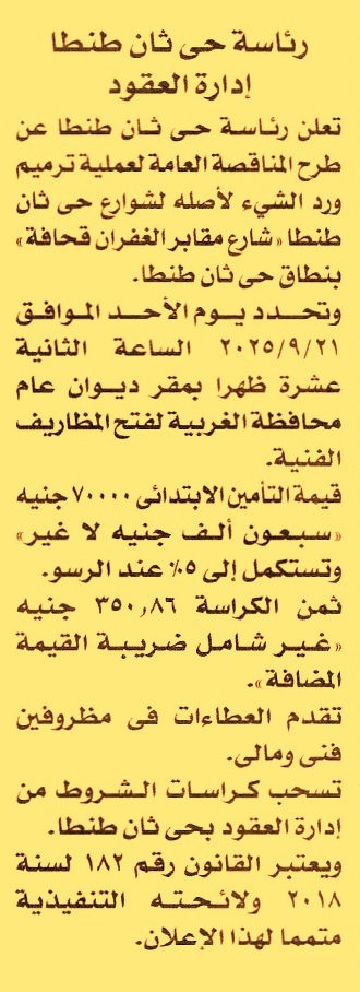HOT Information مناقصة عامة لعملية تنفيذ أعمال ترميم ورد الشئ لأصله لشوارع حي ثان طنطا “شارع مقابر الغفران قحافة” بنطاق حي ثان طنطا عن جريدة الأخبار Post navigation شركة مياه الشرب بالقاهرة الكبرى محافظة السويس