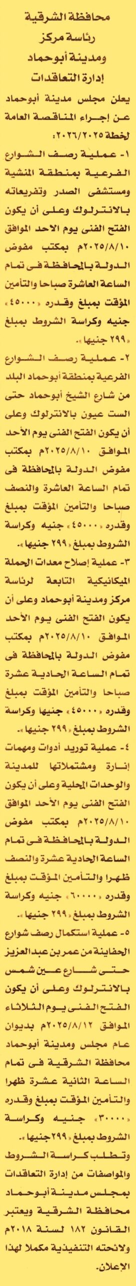 HOT Information مناقصة عامة لعملية رصف الشوارع الفرعية بمنطقة المنشية ومستشفى الصدر وتفريعاته بالانترلوك عن جريدة الأخبار Post navigation رئاسة مركز ومدينة تلا محافظة سوهاج