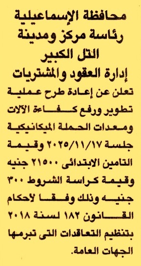 HOT Information إعادة مناقصة عامة لعملية تطوير ورفع كفاءة الألات ومعدات الحملة الميكانيكية عن جريدة الجمهورية Post navigation المصفي القضائي/ صفوت حسن إسماعيل شركة مضارب الشرقية