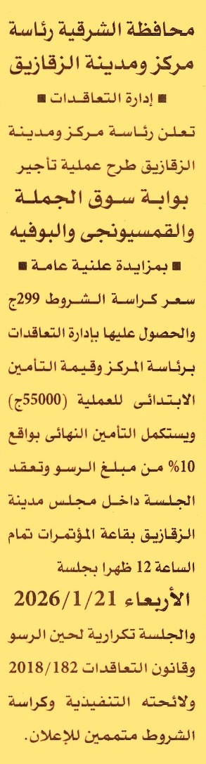 HOT information مزايدة علنية عامة لعملية تأجير بوابة سوق الجملة والقمسيونجي والبوفيه (جلسات تكرارية لحين الرسو) عن جريدة الأهرام Post navigation نادي السلام البحري ببورفؤاد محافظة الإسماعيلية