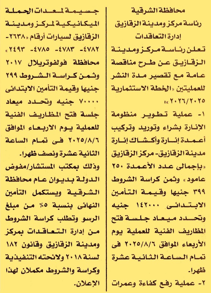 HOT Information مناقصة عامة لعملية تطوير منظومة الإنارة بشراء وتوريد وتركيب أعمدة إنارة وأكشاك إنارة مدينة الزقازيق – مركز الزقازيق بإجمالي عدد 250 عامود عن جريدة الأخبار Post navigation جامعة سنجور بالإسكندرية الوحدة المحلية لمدينة مطوبس