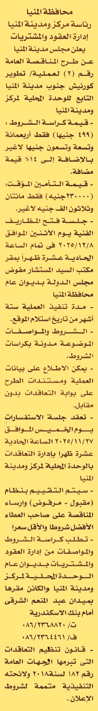 HOT Information مناقصة عامة رقم 2 لعملية تطوير كورنيش جنوب مدينة المنيا مدة التنفيذ 6 أشهر (جلسة الاستفسارات يوم 27/11/2025) عن جريدة الأخبار Post navigation الهيئة العامة للتأمين الصحي فرع وسط الصعيد الإدارة العامة لصرف بني سويف