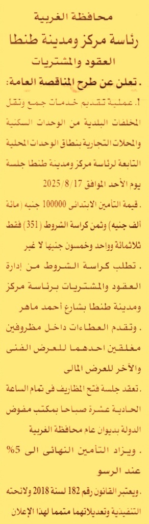 HOT Information مناقصة عامة لعملية تقديم خدمات جمع ونقل المخلفات البلدية من الوحدات السكنية والمحلات التجارية بنطاق الوحدات المحلية التابعة لمركز ومدينة طنطا عن جريدة الأهرام Post navigation رئاسة مركز ومدينة نبروه شركة سيناء للمنجنيز