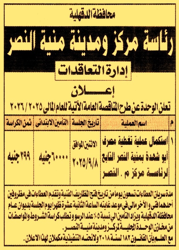 HOT Information مناقصة عامة لعملية استكمال تغطية مصرف أبو شهدة بمنية النصر (مدة سريان العطاءات 3 أشهر) عن جريدة الجمهورية Post navigation مديرية الشئون الصحية بالغربية مديرية المساحة بالقاهرة