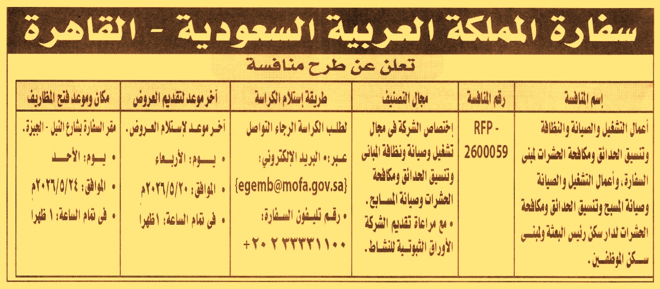 (أخر موعد لتقديم العطاءات يوم 20/5/2026 الساعة 1 ظ)