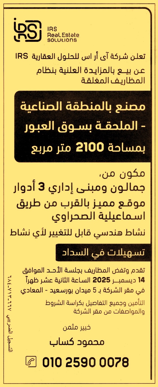 HOT Information مزايدة علنية لعملية بيع مصنع بمساحة 2100م2 بالمنطقة الصناعية الملحقة بسوق العبور مكون من جمالون ومبنى إداري 4 أدوار نشاط هندسي قابل للتغير لأي نشاط بالقرب من طريق اسماعيلية الصحراوي (تسهيلات في السداد) عن جريدة الأهرام Post navigation شركة مصر للطيران للخدمات الأرضية بنك مصر