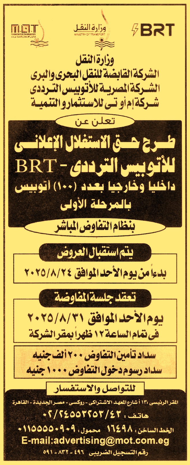 HOT information مزايدة علنية لعملية حق الاستغلال للأتوبيس الترددي BRT داخليا وخارجيا بعدد 100 أتوبيس بالمرحلة الأولى “بنظام التفاوض المباشر” (تعقد جلسة التفاوض يوم 31/8/2025) عن جريدة الأهرام Post navigation Rosatom State Corporation محافظة الغربية