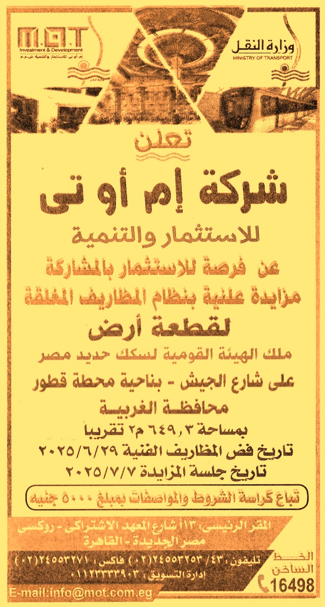 HOT Information مزايدة علنية لعملية الاستثمار بالمشاركة لقطعة أرض ملك الهيئة القومية لسكك حديد مصر بمساحة 649.3م2 تقريبا على شارع الجيش – بناحية محطة قطور – محافظة الغربية (تعقد جلسة المزايدة يوم 7/7/2025) عن جريدة الأخبار Post navigation شركة قنا لصناعة الورق الهيئة المصرية العامة لمشروعات الصرف