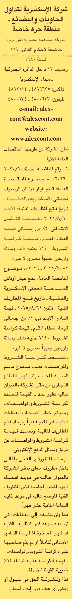 HOT Information مناقصة عامة رقم 1/2025/2026 لعملية توريد قطع غيار أوناش الرصيف لمحطتي الإسكندرية والدخيلة (للشركة الحق في قبول أو رفض أي عطاء دون إبداء الأسباب) عن جريدة الجمهورية Post navigation مركز شباب أبو النمرس نادي الإعلاميين الرياضي