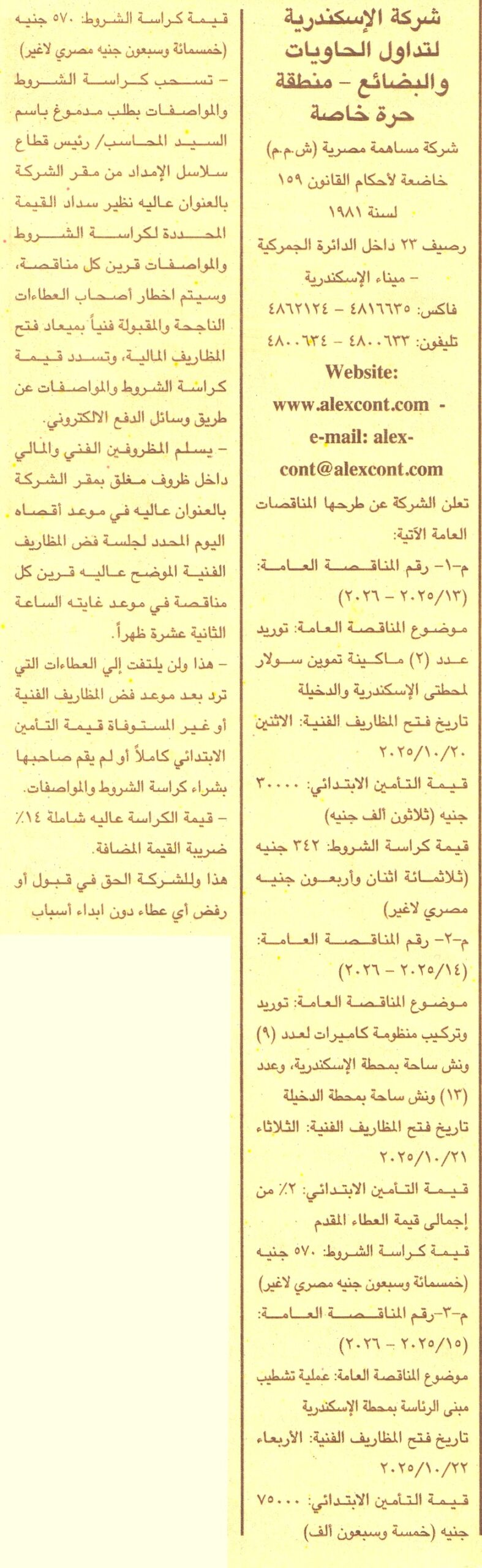 HOT information مناقصة عامة رقم 13/2025/2026 لعملية توريد عدد 2 ماكينة تموين سولار لمحطتي الإسكندرية والدخيلة (للشركة الحق في قبول أو رفض أي عطاء دون إبداء الأسباب) عن جريدة الجمهورية Post navigation الهيئة المصرية العامة للمعارض والمؤتمرات شركة مياه الشرب بالإسكندرية