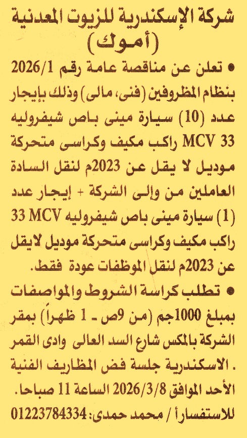 تأجير عدد 10 سيارة ميني باص شيفروليه MCV 33 راكب مكيف وكراسي متحركة موديل لا يقل عن 2023 لنقل السادة العاملين من وإلى الشركة