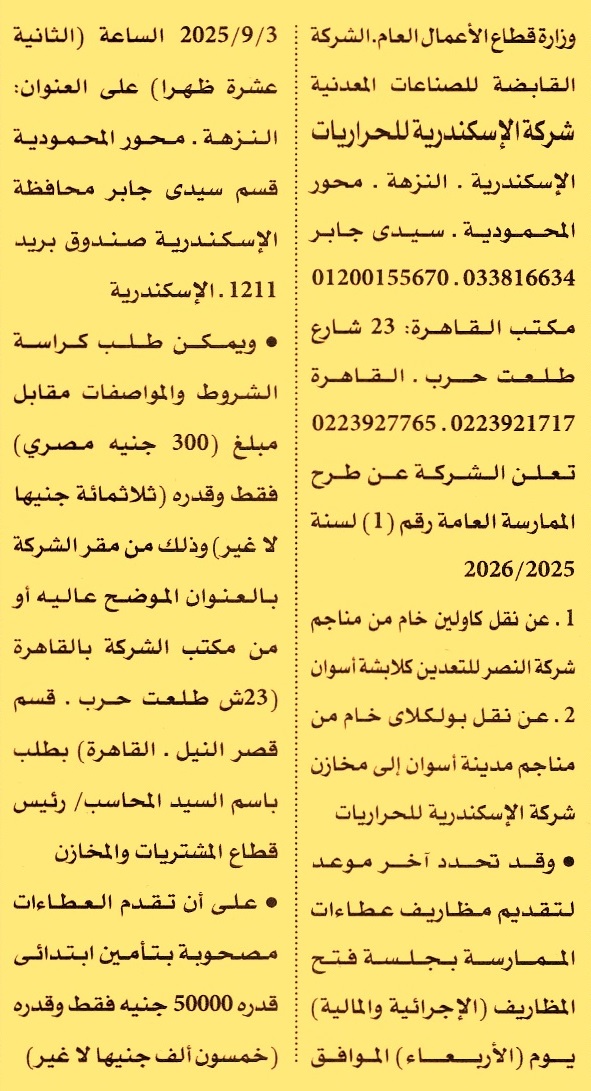 HOT Information ممارسة عامة رقم 1/2024/2025 لعملية نقل كاولين خام من مناجم الشركة بكلابشة – أسوان ونقل بولكلاي خام من مناجم مدينة أسوان إلى مخازن الشركة عن جريدة الأهرام Post navigation نادي المستقبل بدمياط الجديدة شركة الإسكندرية للبترول