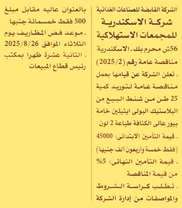 HOT Information مناقصة عامة رقم 2/2025 لعملية توريد كمية 25 طن من شنط البيع من البلاستيك البولي ايثيلين خامة بيور عالي الكثافة طباعة 2 لون عن جريدة الأهرام Post navigation الشركة الدولية للخدمات البريدية البنك الاهلي المصري
