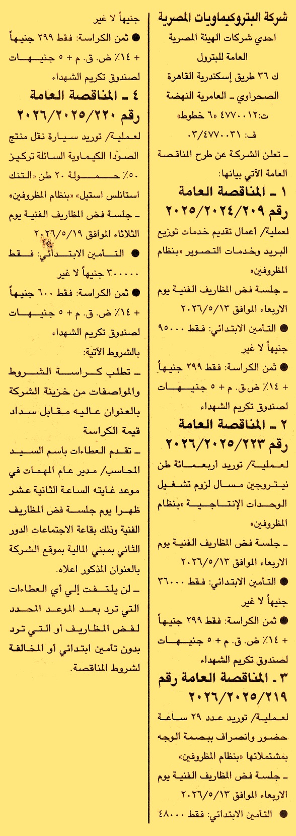 HOT Information مناقصة عامة رقم 209/2025/2026 لعملية تقديم خدمات توزيع البريد وخدمات التصوير (يسدد التأمين بتحويل بنكي أو بشيك مصرفي أو بخطاب ضمان) عن جريدة الجمهورية Post navigation شركة قنا لصناعة الورق