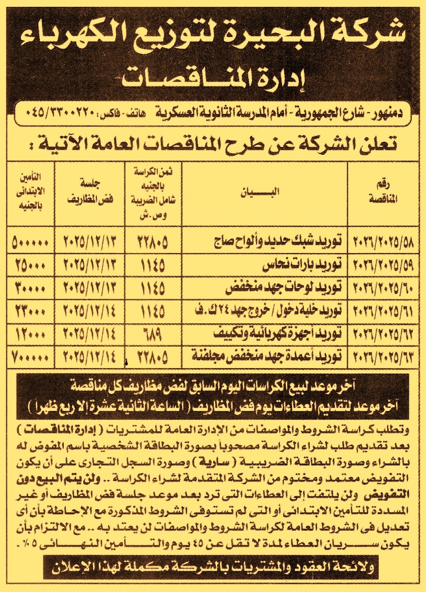 HOT Information مناقصة عامة رقم 58/2025/2026 لعملية توريد شبك حديد وألواح صاج (أخر موعد لبيع الكراسة اليوم السابق لفض المظاريف ويرفق مع المستندات صورة البطاقة الشخصية ومدة سريان العطاءات 45 يوم) عن جريدة الجمهورية Post navigation مركز التنمية الشبابية بقويسنا الإدارة العامة لتطوير وحماية نهر النيل جنوب فرع رشيد بطنطا