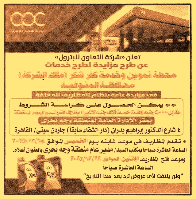 HOT Information مزايدة عامة لعملية إستغلال خدمات محطة تموين وخدمة كفر شكر “ملك الشركة” بمحافظة المنوفية (أخر موعد لتقديم العطاءات يوم 18/12/2025 الساعة 10 ص) عن جريدة الأخبار Post navigation شركة المستودعات المصرية العامة نادي حلوان الرياضي