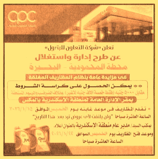 HOT Information مزايدة عامة لعملية إدارة وإستغلال خدمات محطة تموين وخدمة المحمودية بالبحيرة (أخر موعد لتقديم العطاءات يوم 15/1/2026 الساعة 10 ص) عن جريدة الأخبار Post navigation شركة التعاون للبترول شركة الصرف الصحي للقاهرة الكبرى