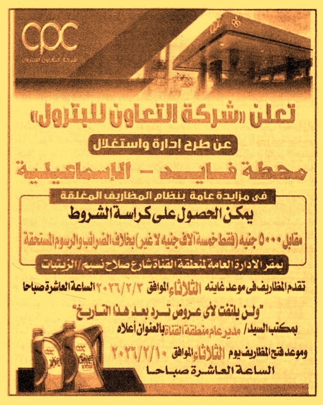 HOT information مزايدة عامة لعملية إدارة وإستغلال محطة فايد – الإسماعيلية (أخر موعد لتقديم العطاءات يوم 2/2/2026 الساعة 10 ص) عن جريدة الجمهورية Post navigation النقابة العامة للمهن الرياضية شركة التعاون للبترول