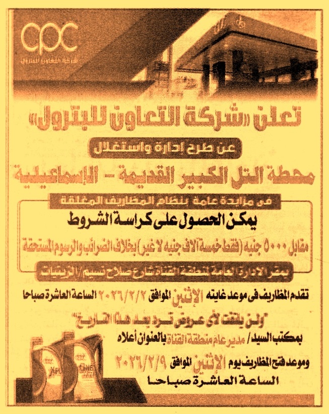 HOT information مزايدة عامة لعملية إدارة وإستغلال محطة التل الكبير القديمة – الإسماعيلية (أخر موعد لتقديم العطاءات يوم 2/2/2026 الساعة 10 ص) عن جريدة الجمهورية Post navigation شركة التعاون للبترول شركة التعاون للبترول