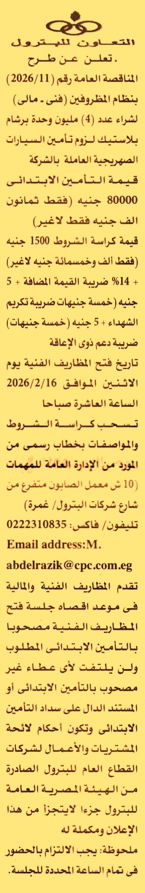 HOT Information مناقصة عامة رقم 11/2026 لعملية توريد عدد 4 مليون وحدة برشام بلاستيك لزوم تأمين السيارات الصهريجية العاملة بالشركة عن جريدة الأهرام Post navigation جامعة القاهرة مركز التدريب الإقليمي للموارد المائية والري