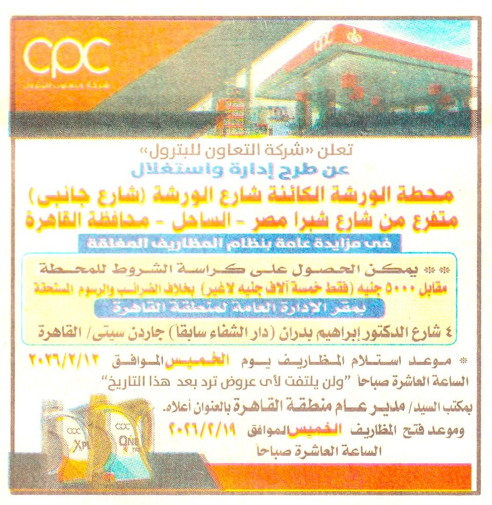 HOT information مزايدة عامة لعملية إدارة وإستغلال محطة الورشة الكائنة شارع الورشة (شارع جانبي) متفرع من شارع شبرا مصر الساحل – محافظة القاهرة (أخر موعد لتقديم العطاءات يوم الخميس 12/2/2026 الساعة 10 ص) عن جريدة الأخبار Post navigation شركة التعاون للبترول جهاز مشروعات أراضي وزارة الداخلية