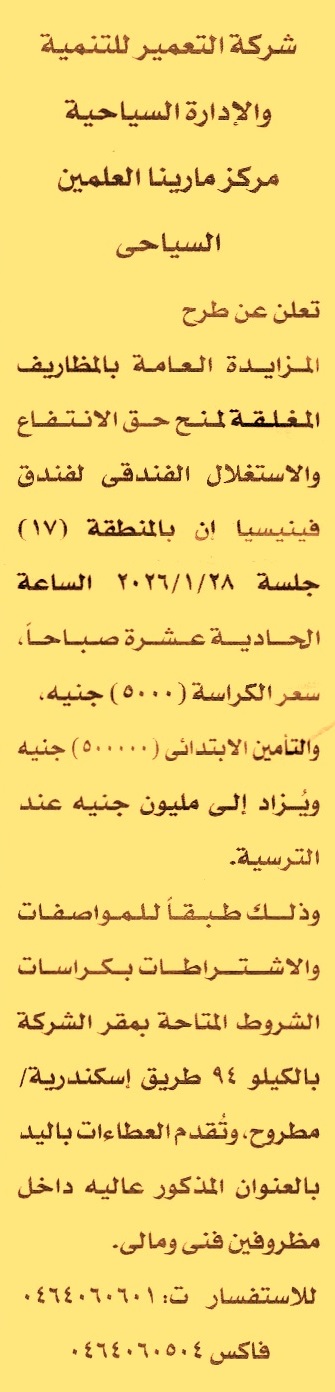 HOT Information مزايدة عامة رقم 4 لعملية حق الانتفاع والاستغلال الفندقي لفندق فينيسيا إن بالمنطقة 17 عن جريدة الأخبار Post navigation شركة إم أو تي للاستثمار والتنمية نادي مطوبس الرياضي