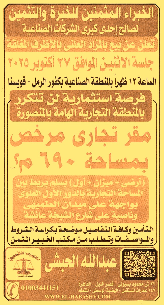 بواجهة على ميدان الطميهي وناصية شارع الشيخة عائشة – المنصورة