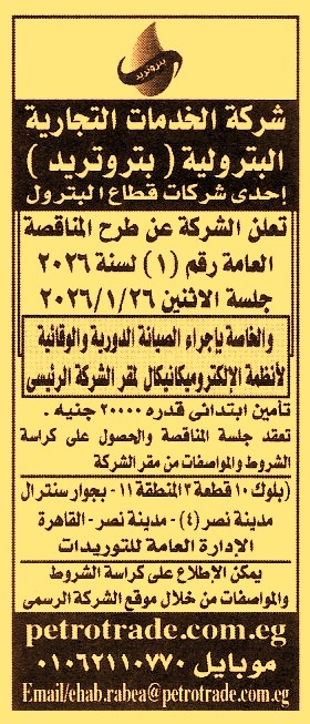 HOT Information مناقصة عامة رقم 1/2026 لعملية تنفيذ أعمال الصيانة الدورية والوقائية لأنظمة الكهروميكانيكال لمقر الشركة الرئيسي عن جريدة الأهرام Post navigation الجمعية المصرية للتنمية الانسانية بسوهاج مركز البحوث النووية