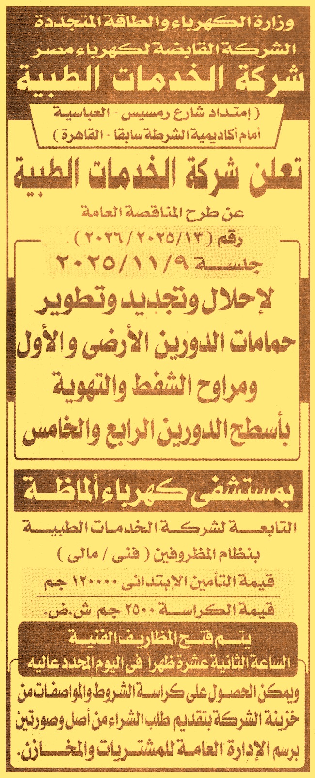 HOT Information مناقصة عامة رقم 13/2024/2025 لعملية إحلال وتجديد وتطوير حمامات الدورين الأرضي والأول ومراوح الشفط والتهوية بأسطح الدورين الرابع والخامس (يقدم طلب شراء الكراسة من أصل وصورتين) عن جريدة الجمهورية Post navigation مستشفيات جامعة المنيا رئاسة حي المعادي