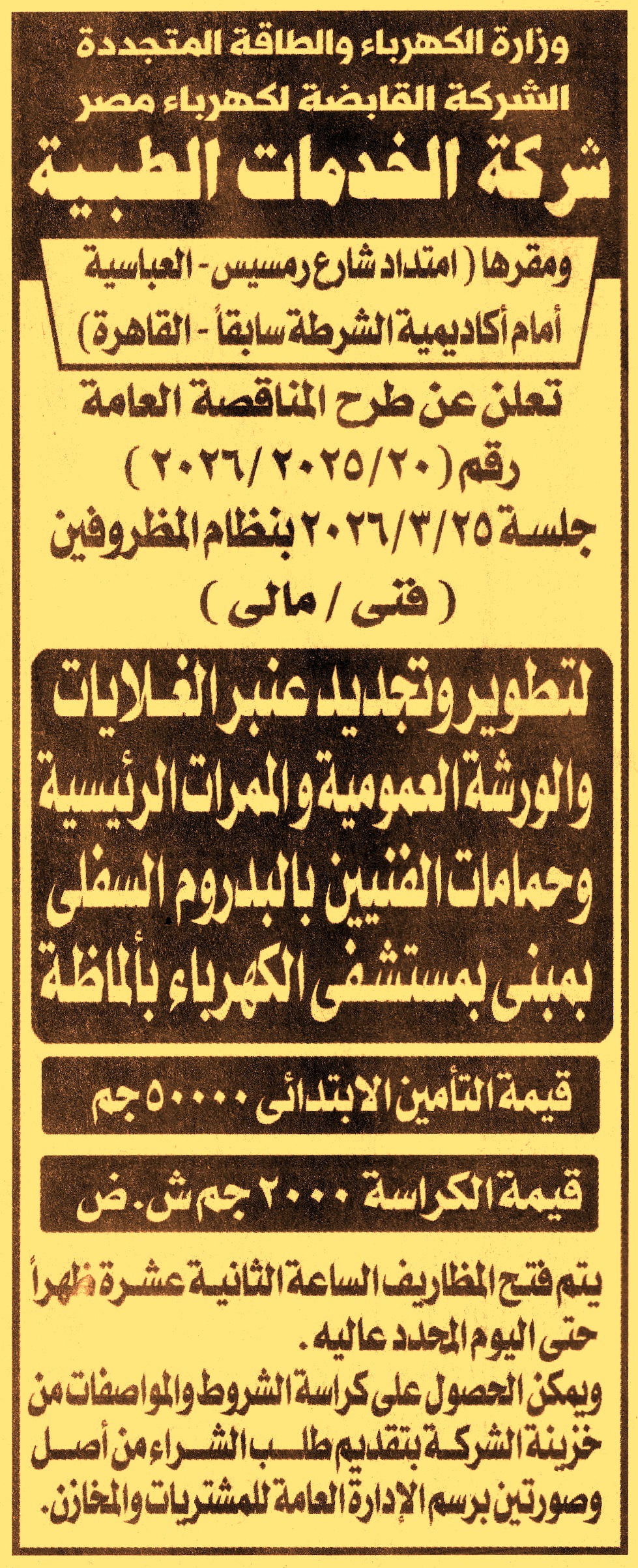 HOT Information مناقصة عامة رقم 20/2025/2026 لعملية تطوير وتجديد عنبر الغلايات والورشة العمومية والممرات الرئيسية وحمامات الفنيين بالبدروم السفلي بمبنى بمستشفى الكهرباء بألماظة (يقدم طلب شراء الكراسة من أصل وصورتين) عن جريدة الجمهورية Post navigation الهيئة العامة لميناء الإسكندرية الشركة القابضة لمصر للطيران