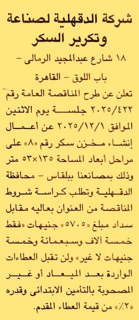 HOT Information مناقصة عامة رقم 422/2025 لعملية إنشاء مخزن سكر رقم 8 على مراحل أبعاد المساحة 135×53م بمصنع الشركة ببلقاس – محافظة الدقهلية عن جريدة الجمهورية Post navigation محافظة المنوفية نادي المعلمين الرياضي ببني سويف