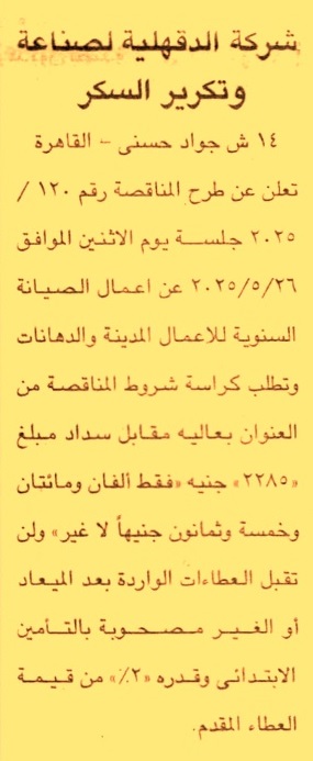HOT Information مناقصة عامة رقم 120/2025 لعملية تنفيذ أعمال الصيانة السنوية للأعمال المدنية والدهانات عن جريدة الجمهورية Post navigation الجمعية المنزلية للعاملين بشركة الغزل والنسيج بالمحلة الكبرى شركة مطاحن ومخابز شمال القاهرة