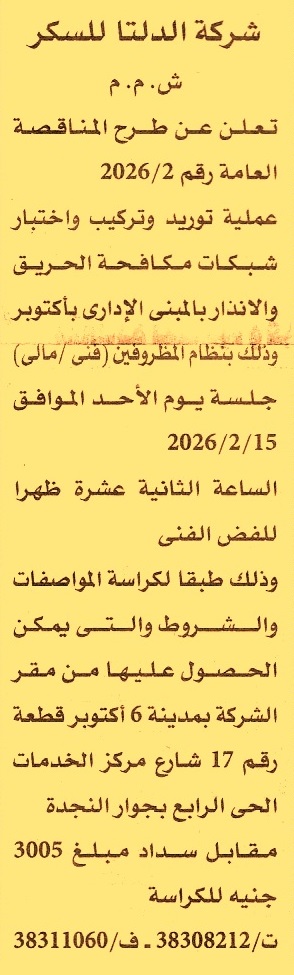 HOT information مناقصة عامة رقم 2/2026 لعملية توريد وتركيب واختبار شبكات مكافحة الحريق والانذار بالمبنى الإداري بأكتوبر عن جريدة الأهرام Post navigation شركة الغازات البترولية جامعة قنا