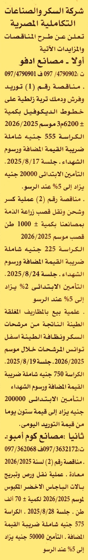 HOT information مناقصة عامة رقم 1 لعملية توريد وفرش ودمك تربة زلطية على خطوط الديكوفيل بكمية ±6200م3 موسم 2025/2026 عن جريدة الأهرام Post navigation شركة شمال الدلتا لتوزيع الكهرباء الهيئة العامة للتنمية الصناعية