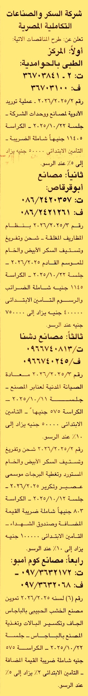 HOT Information مناقصة عامة رقم 2/2025/2026 لعملية توريد الأدوية لمصانع ووحدات الشركة عن جريدة الجمهورية Post navigation الجمعية التعاونية للبناء والإسكان لأعضاء نقابة المهندسين بالبحيرة محافظة قنا