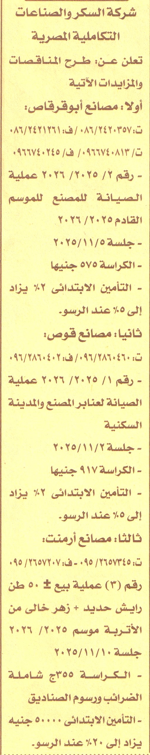 HOT information مناقصة عامة رقم 2/2025/2026 لعملية الصيانة للمصنع للموسم القادم 2025/2026 عن جريدة الأخبار Post navigation شركة مصر للبترول جمعية الشباب الوطني للإسكان التعاوني