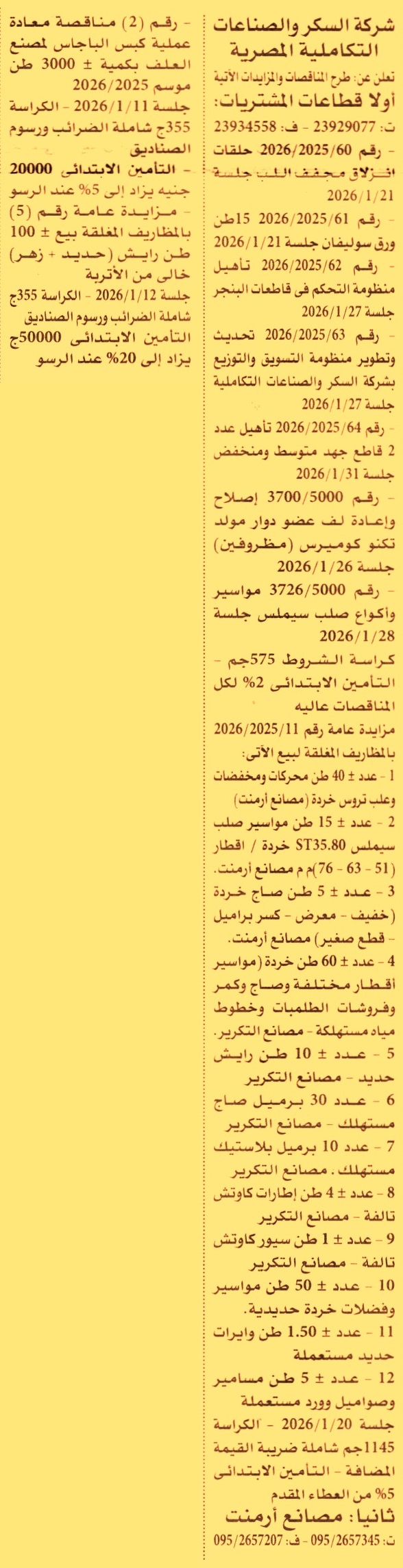 HOT Information مناقصة عامة رقم 60/2025/2026 لعملية توريد حلقات انزلاق مجفف اللب عن جريدة الأهرام Post navigation مركز التنمية الشبابية بشبين القناطر الهيئة العامة للنظافة والتجميل