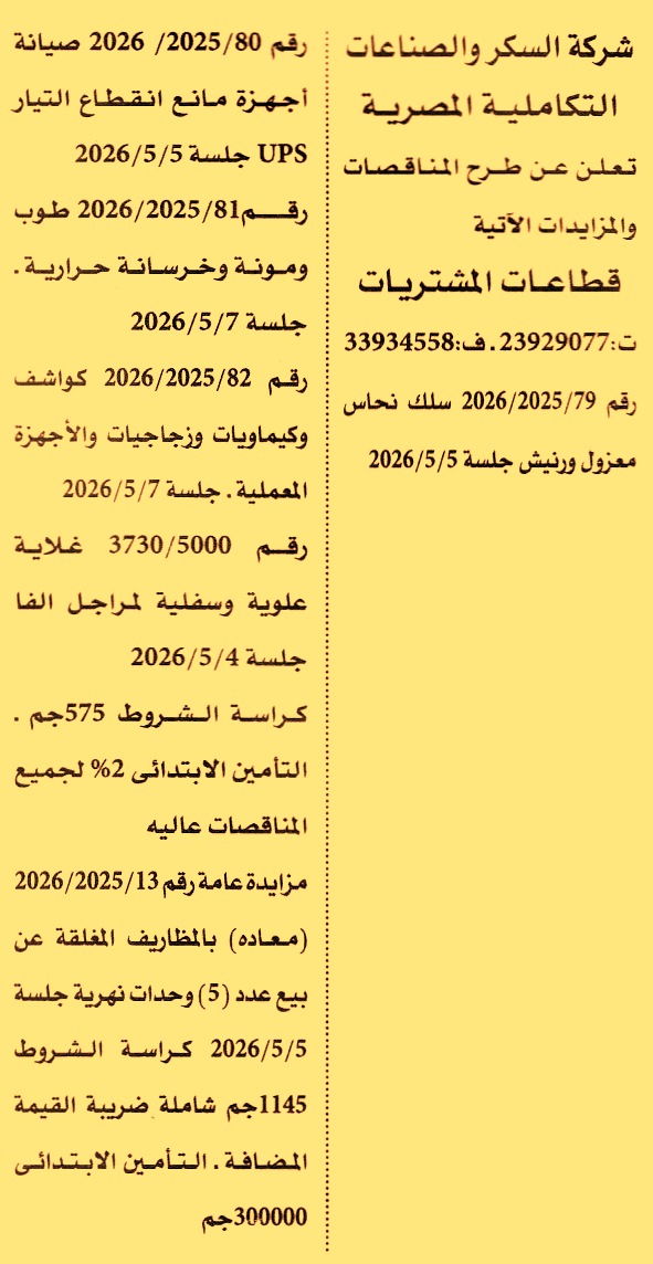HOT information مناقصة عامة رقم 79/2025/2026 لعملية توريد سلك نحاس معزول ورنيش عن جريدة الأهرام Post navigation نادي التمساح الرياضي بالإسماعيلية الهيئة القومية لسكك حديد مصر