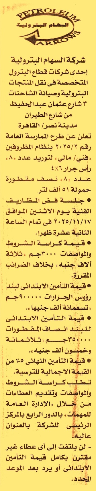 HOT Information ممارسة عامة رقم 2/2025 لعملية توريد الأتي (1) عدد 8 رأس جرار 6×4 (2)عدد 8 نصف مقطورة حمولة 51 ألف لتر عن جريدة الأخبار Post navigation هيئة إستاد القاهرة الهيئة المصرية العامة للكتاب