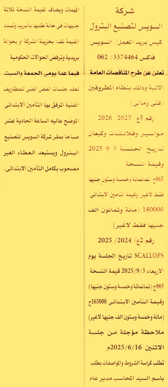 HOT Information مناقصة عامة رقم 5ع/2024/2025 لعملية توريد مواسير وفلانشات وكيعان عن جريدة الأهرام Post navigation الشركة المصرية للمطارات مركز التنمية الشبابية بالكوم الأخضر