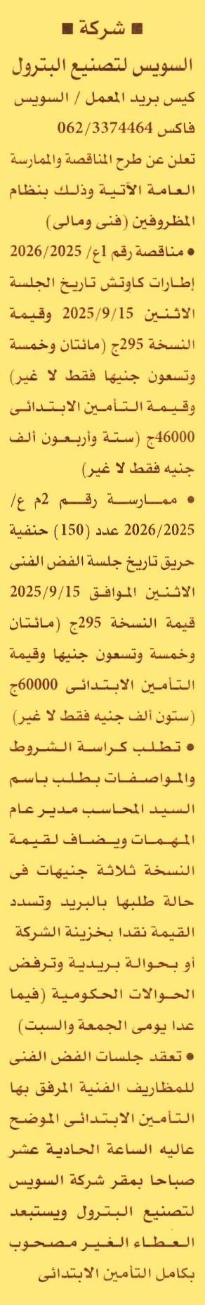 HOT Information مناقصة عامة رقم 1ع/2025/2026 لعملية توريد إطارات كاوتش عن جريدة الأهرام Post navigation شركة مطاحن مصر الوسطى مؤسسة أخبار اليوم