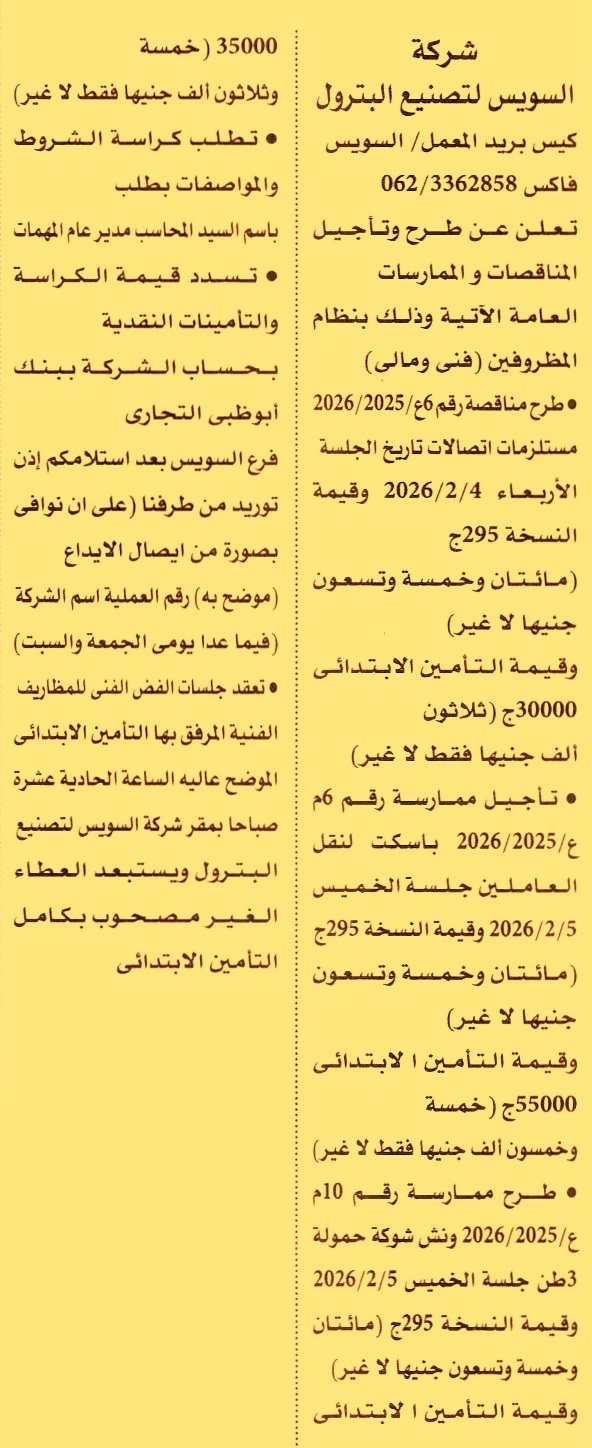 HOT information مناقصة عامة رقم 6ع/2025/2026 لعملية توريد مستلزمات اتصالات عن جريدة الأهرام Post navigation الوحدة المحلية لمركز ومدينة بني سويف المعمل المركزي لبحوث الثروة السمكية