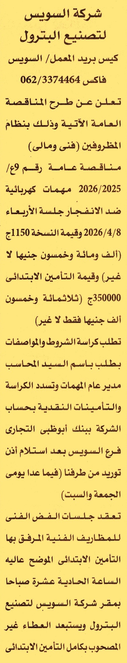HOT Information مناقصة عامة رقم 9م ع/2025/2026 لعملية توريد مهمات كهربائية ضد الانفجار عن جريدة الأهرام Post navigation الجهاز التنفيذي للمشروعات الصناعية والتعدينية شركة السكر والصناعات التكاملية المصرية