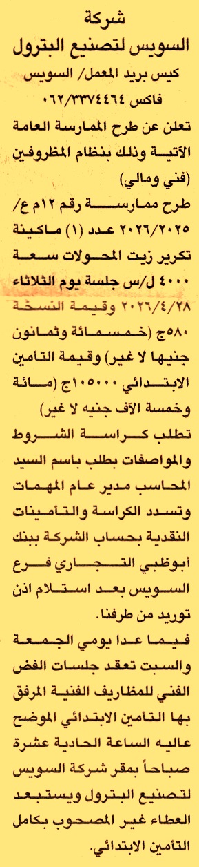 HOT Information مناقصة عامة رقم 12م ع/2025/2026 لعملية توريد عدد 1 ماكينة تكرير زيت المحولات سعة 4000 ل/س عن جريدة الجمهورية Post navigation مركز التنمية الشبابية بفارسكور الهيئة العامة للاستثمار والمناطق الحرة