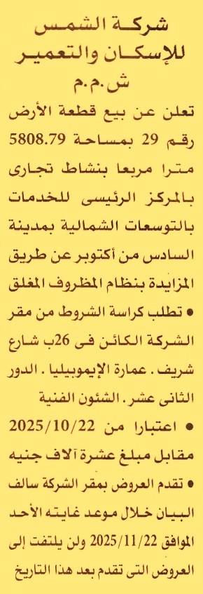 بيع قطعة الأرض رقم 29 بمساحة 5808.79م2 بنشاط تجاري